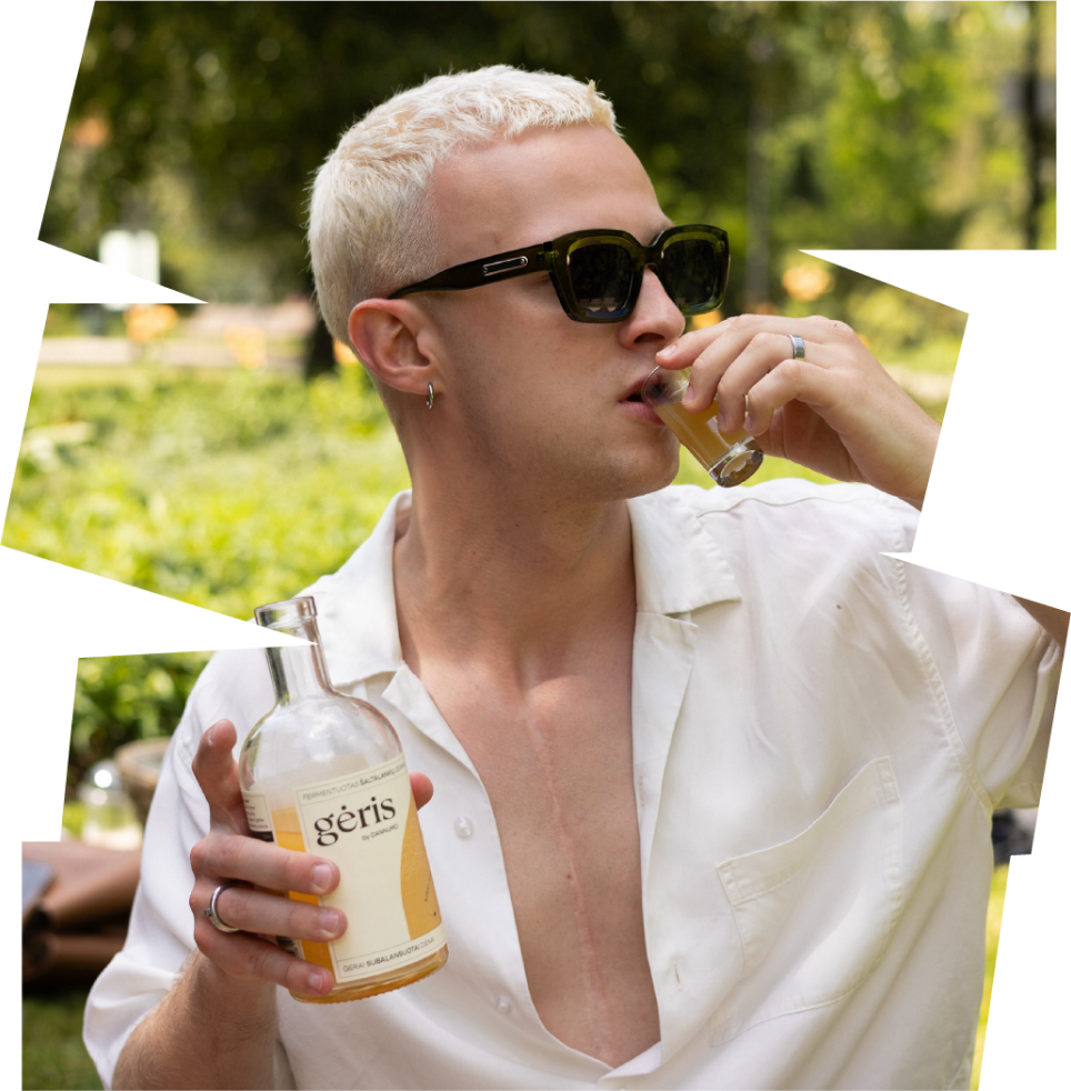 Nededame GĖRIO į tą pačią lentyną su limonadais - tai biologiškai aktyvus gėrimas, kuriame nėra pridėtinio cukraus, konservantų, stabilizatorių ir dažiklių. Fermentacijos proceso metu bakterijos dirba be išeiginių ir verčia natūralius ingredientus rūgštimi bei dujomis - tai ir sukelia neįprastą, rūgštų skonį. Kiekvienas mūsų gali pasigirti unikaliais liežuvio čiuptuvėliais, suvokiančiais skonį, todėl sukūrėme įvairių GĖRIO skonių paletę, kad visi galėtų atrasti sau labiausiai tinkamą, o gal net atrastų savo umami. Vis dėlto, jei gryno skonio nepavyksta prisijaukinti, pabandyk įmaišyti GĖRIO į vandenį ar mėgstamus gėrimus, pavyzdžiui šaltą rytinį glotnutį, o gal pagardink juo salotas? Laisvė rinktis kaip ir su kuo, tik svarbu atmink: venk GĖRIO sąlyčio su karštais gėrimais ar patiekalais, nes gerosios bakterijos gali žūti!
